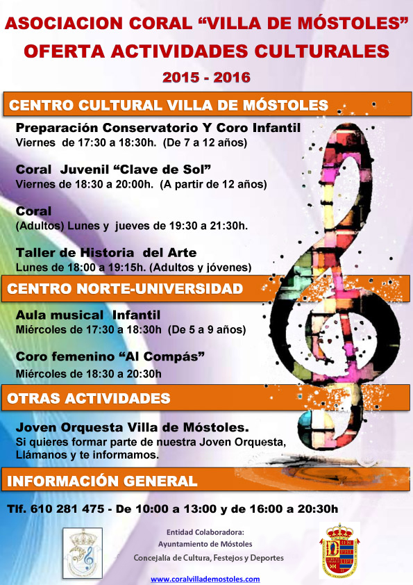 La Asociación Coral Villa de Móstoles presenta su oferta de actividades culturales dirigidas a aquellas personas que estén interesadas en adentrarse en el mundo del canto correspondientes al curso 2015-2016.