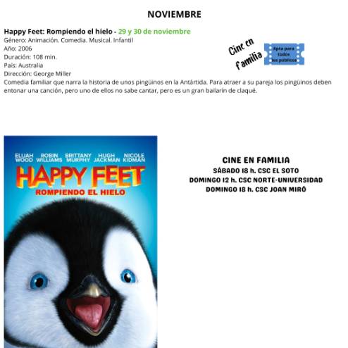 Los más pequeños tienen una cita con el mejor cine infantil con "Cine en Familia". La película de esta semana será "Happy Feet: Rompiendo el hielo", que se podrá ver el sábado 29, a las 18:00 h, en el Centro Sociocultural El Soto y el domingo 30 a las 12:00 h en el Centro Sociocultural Norte-Universidad y a las 18:00 h en el Centro Sociocultural Joan Miró.