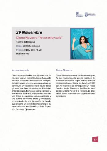 Además, el sábado 29 la cantante malagueña Diana Navarro estará, a las 20:00 h, en el Teatro del Bosque con su espectáculo "Ya no estoy sola", con el que celebra 20 años de trayectoria. Propone un espectáculo que fusiona lo musical, lo teatral y lo emocional a través de los géneros que han construido su identidad artística: copla, flamenco, saeta, zarzuela y electrónica. Todo ello interpretado con una voz única, de registros sobrecogedores y una puesta en escena íntima y sofisticada, acompañada de una formación de banda que propone un recorrido emocional.