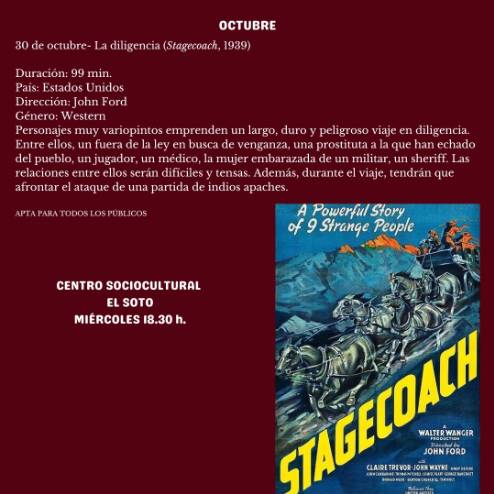 El miércoles 30 el ciclo de cine "Filmoteca" trae la proyección en versión original de la película "La diligencia". Se podrá ver a las 18:30 h en el Centro Sociocultural El Soto.