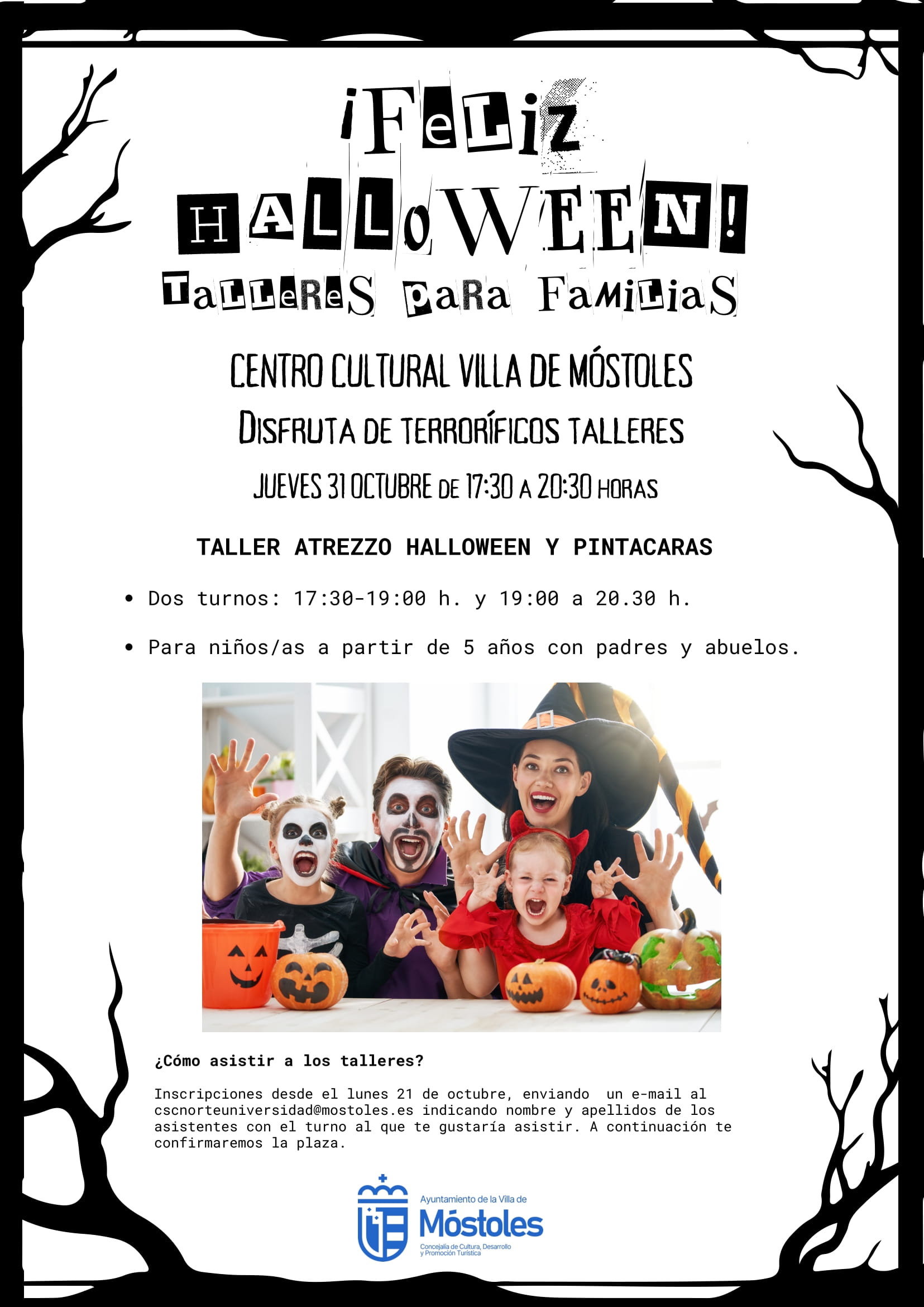 Los niños a partir de 5 años podrán participar el jueves 31 en "¡Feliz Halloween!", un taller de atrezzo y pintacaras, en el Centro Cultural Villa de Móstoles. Habrá dos turnos, uno a las 17:30 h y otro a las 19:00 h.