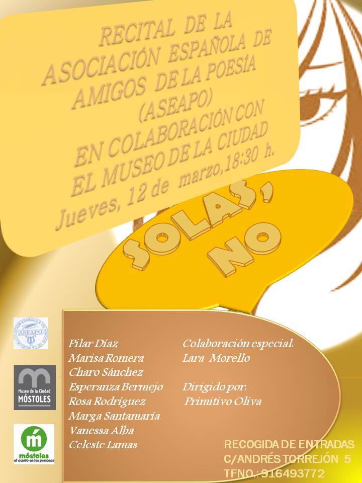 Imagen en alta resolución. Este enlace se abrirá mediante lightbox, puede haber un cambio de contextoLa programación de "Los Jueves, Museo", presenta el próximo día 12 de marzo a las 18:30 el recital "Solas, no", interpretado por la Asociación Española de Amigos de la Poesía (ASEAPO). Las entradas se pueden recoger en el Museo de la Ciudad a partir del martes 10, desde las 10:00 h.