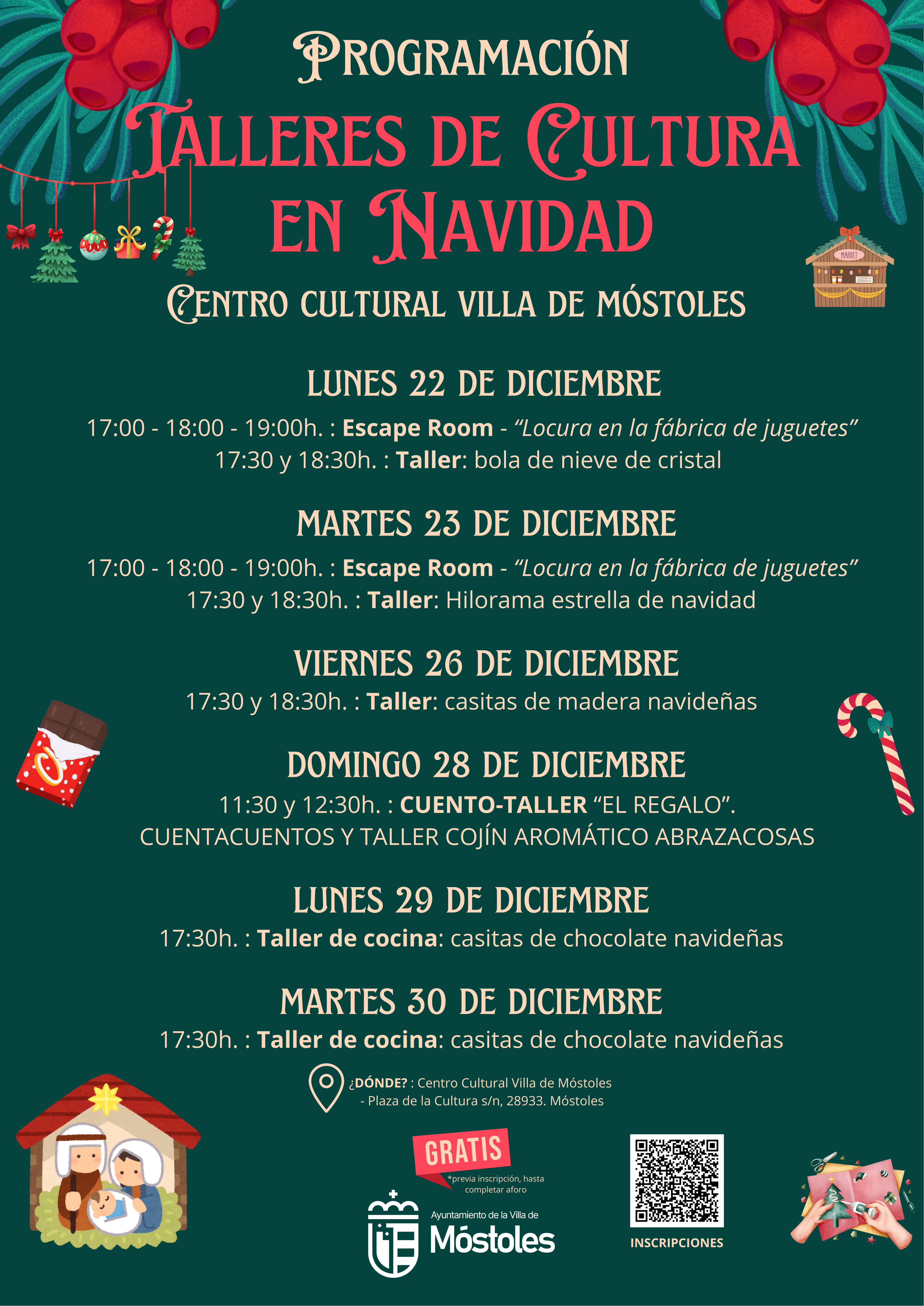 - Estos talleres de temática navideña, organizados por el Ayuntamiento de Móstoles, se desarrollarán durante las vacaciones escolares de Navidad, en el Centro Cultural Villa de Móstoles, del 22 al 30 de diciembre.