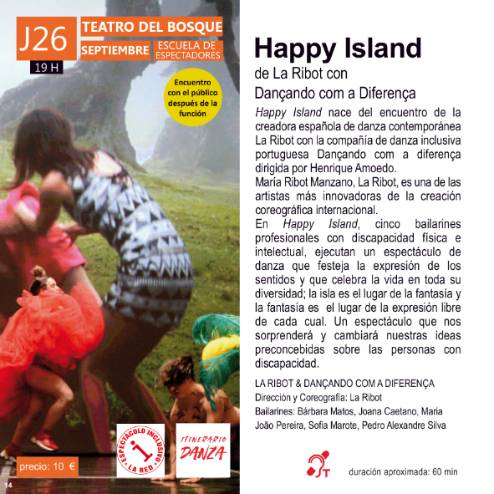 Imagen en alta resolución. Este enlace se abrirá mediante lightbox, puede haber un cambio de contextoLa nueva edición de `A Escena Móstoles´ comienza mañana jueves 26 septiembre a las 19 horas en el Teatro del Bosque con el espectáculo de danza contemporánea "Happy Island", que cuenta entre sus intérpretes con bailarines profesionales con discapacidad física e intelectual de la compañía portuguesa "Dançando com a diferença", con dirección y coreografía de La Ribot.