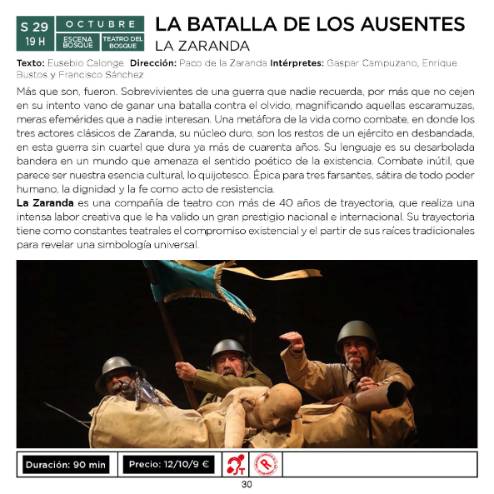 El sábado 29 a las 19:00 h en el Teatro del Bosque se representará "La batalla de los ausentes" dirigida por Paco de la Zaranda e interpretada por Gaspar Campuzano, Enrique Bustos y Francisco Sánchez.