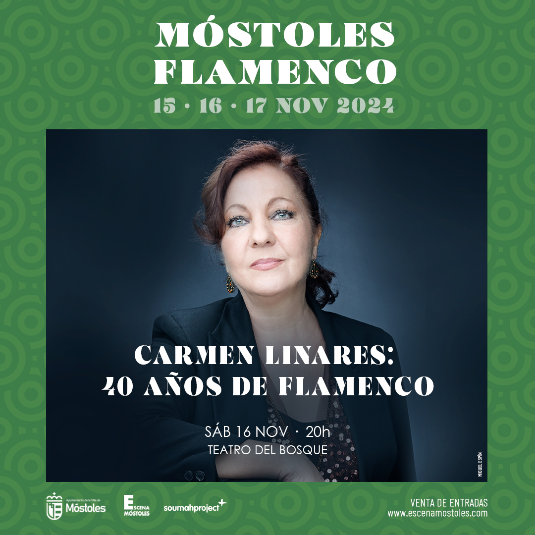 El Teatro del Bosque será el escenario que acoja el espectáculo de una artista de renombre como es "Carmen Linares: 40 años de Flamenco", el sábado 16 de noviembre, a las 20:00 h. Acompañada de guitarras y palmeras de Triana, la gran Carmen Linares interpreta una antología de cantes de mujer, incluyendo alegrías, soleares y fandangos, expresando la esencia de Lorca y de Miguel Hernández.