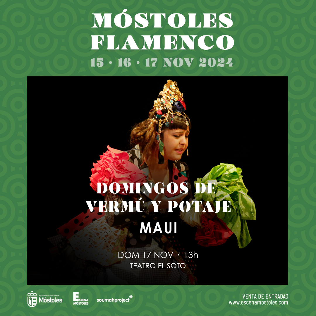 Para el domingo, la cantante y actriz flamenca sevillana, Maui, de Utrera, que experimenta con la palabra, el compás y el humor, pondrá en escena en el Teatro del Centro Sociocultural El Soto, a las 13:00 h, su espectáculo "Domingos de Vermú y Potaje", unasátira sobre el frenético estilo de vida.