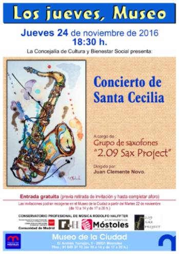 Concierto Santa CeciliaImagen en alta resolución. Este enlace se abrirá mediante lightbox, puede haber un cambio de contextoConcierto Santa CeciliaLa Concejalía de Cultura y Bienestar presenta el jueves 24 de noviembre a las 18:30, en el Museo de la Ciudad, al grupo de saxofones "2.09 SAX PROJECT" . Este conjunto es el exponente artístico de la actividad que nace en el Aula de Saxofón del Conservatorio Profesional de Música "Rodolfo Halffter" de Móstoles, bajo la dirección de Juan Clemente. El grupo tiene como objetivo seguir desarrollando el proyecto que se inició en el 2009 con el Ensemble de saxofones "Rodolfo Halffter".