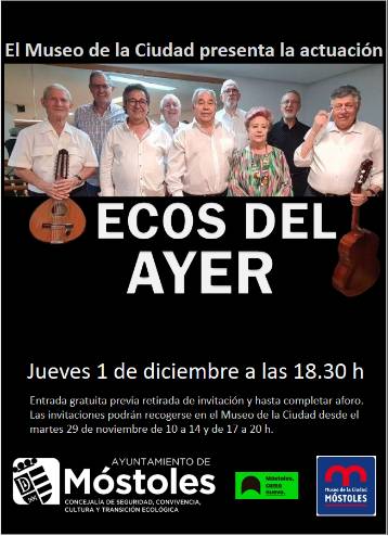 En el Museo de la Ciudad, el grupo musical mostoleño "Ecos del ayer" interpretará el jueves 1 a las 18:30 h, diferentes estilos musicales, (boleros, pasodoble, etc.) con las canciones que nos han acompañado durante años y que pertenecen ya a la memoria colectiva.