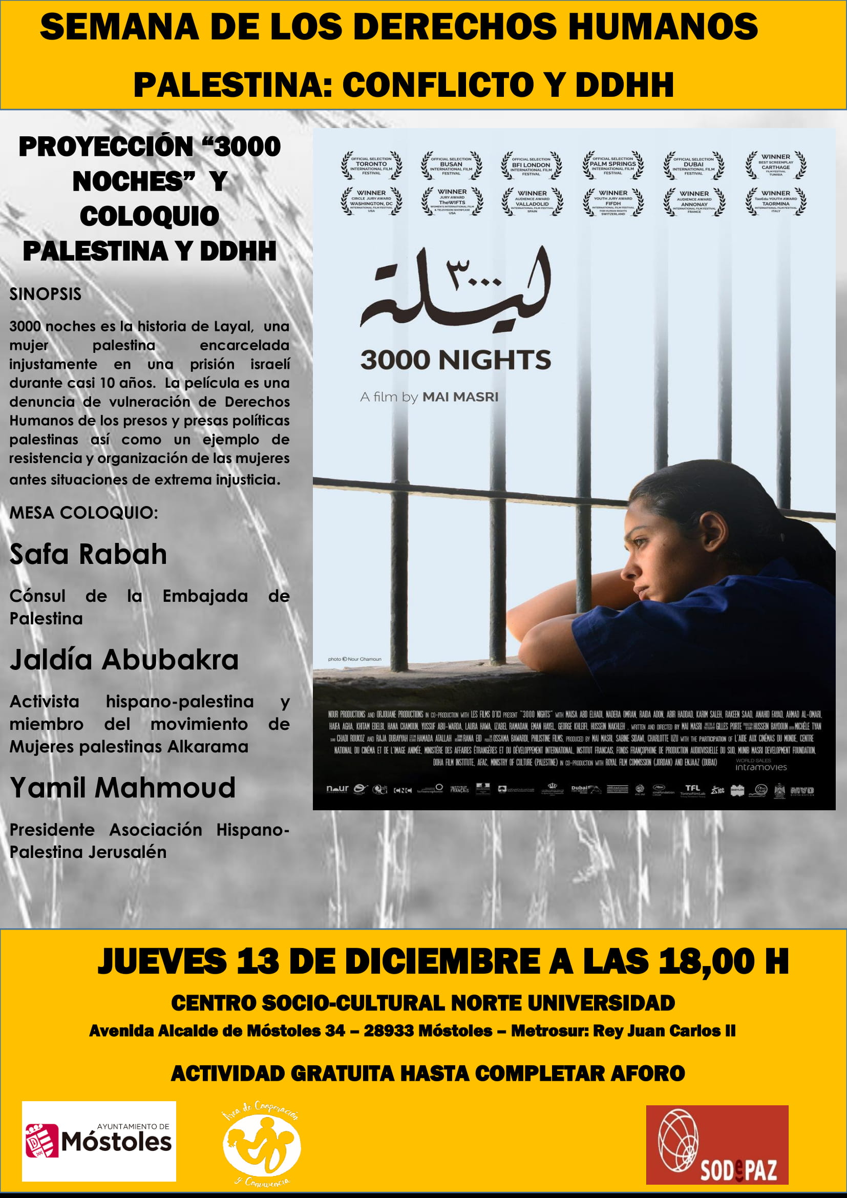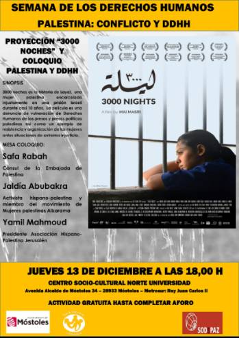 El jueves 13 se proyectará la película "3000 noches", la historia de una mujer palestina encarcelada en una prisión israelí. Posteriormente contaremos con la presencia de Sara Rabah, Cónsul de la Embajada de Palestina, Jaldía Abubakra, activista hispano-palestina y miembro del Movimiento de Mujeres Palestinas Alkarama y Laura Marcilli, responsable de proyectos en Palestina de Sodepaz, que colabora con el evento.