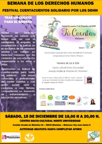El cierre de la jornada, sábado 15, contará con la celebración del Festival de Cuentacuentos "Tú cuentas" a cargo del colectivo "De un niño para otro". Será para todos los públicos y abierto a la participación, en él colaborarán artistas profesionales del cuento que de forma altruista han querido ser parte del evento. Los asistentes deberán donar un cuento o material escolar que será enviado a los campamentos saharauis de Tindouf en la próxima caravana solidaria al Sáhara.