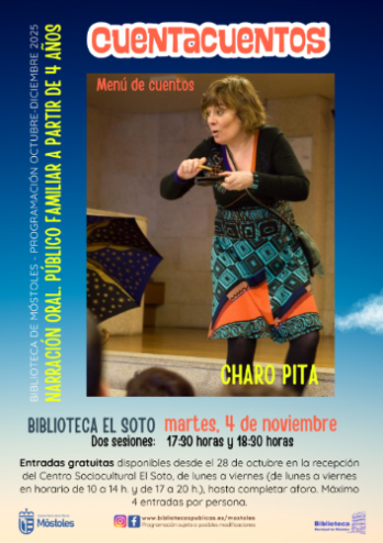El día 4 también se podrá disfrutar de un "Menú de cuentos", a cargo de Charo Pita, en el Centro Sociocultural El Soto, en dos sesiones de 30 minutos, a las 17:30 h y a las 18:30 h. Este cuentacuentos está dirigido a niños a partir de cuatro años y en él se podrán escuchar historias saladas al estilo de las patatas fritas, historias tan tristes como los botes de espárragos y tan tiernas como los filetes de merluza, depende del menú del día. La entrada es gratuita, previa retirada de invitaciones en la recepción del propio centro.