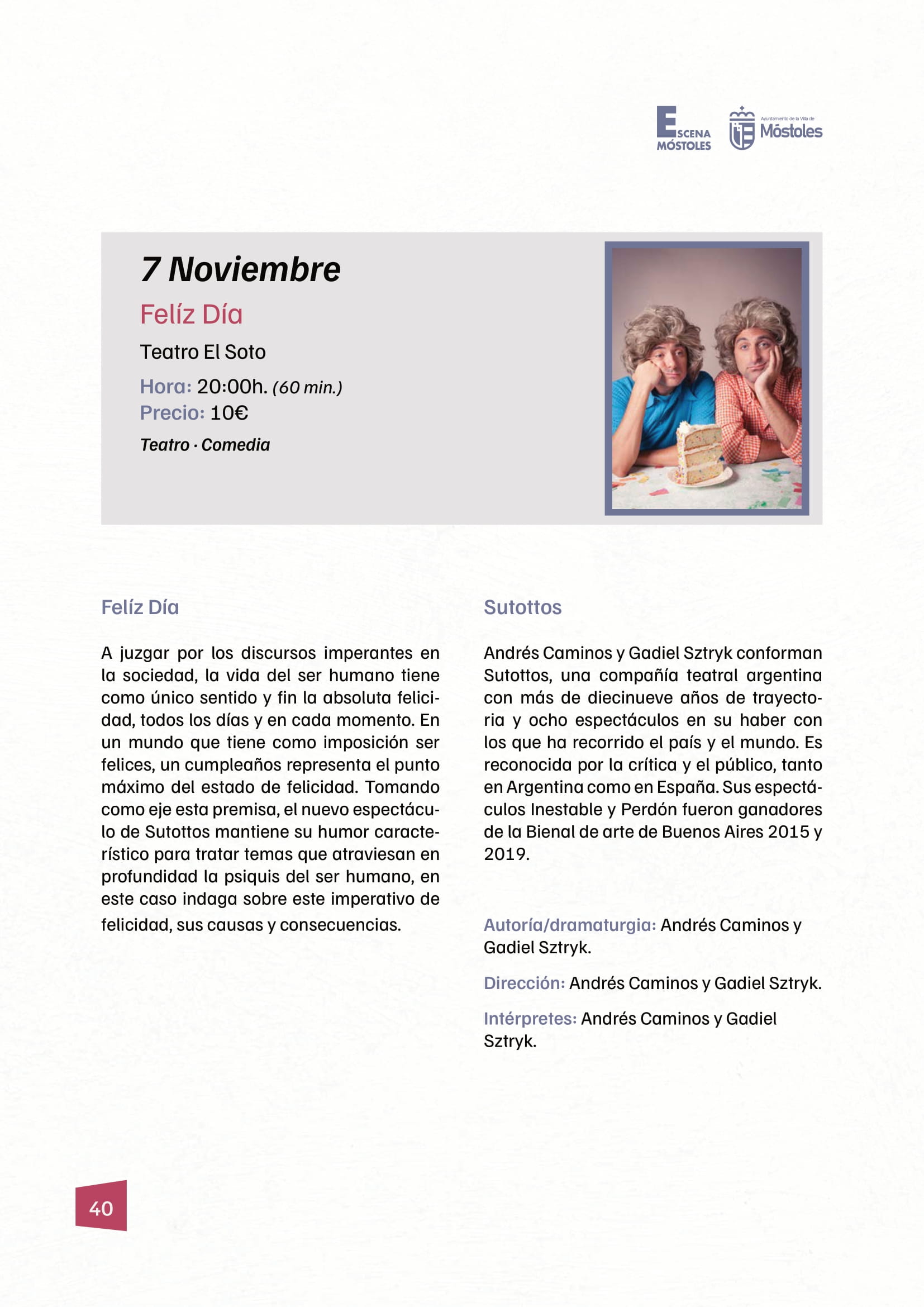 Y el día 7, el Teatro El Soto ofrecerá, a las 20:00 h, la comedia "Feliz día", a cargo de la compañía teatral argentina Sutottos, que con su humor característico pone de relieve el imperativo de felicidad que hay en la sociedad, sus causas y consecuencias, tomando como hilo conductor la celebración de un cumpleaños, como máxima expresión de felicidad.