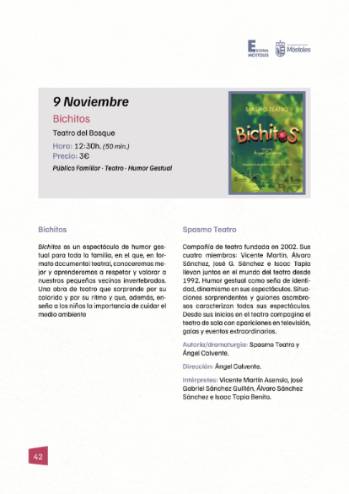 Y la mañana del domingo las familias podrán disfrutar de "Bichitos", en el Teatro del Bosque, a las 12:30 h. Esta obra de teatro, de humor gestual para todos los públicos, a cargo de Spasmo Teatro, sorprende por su colorido y ritmo y que enseña valores de cuidado del medio ambiente.