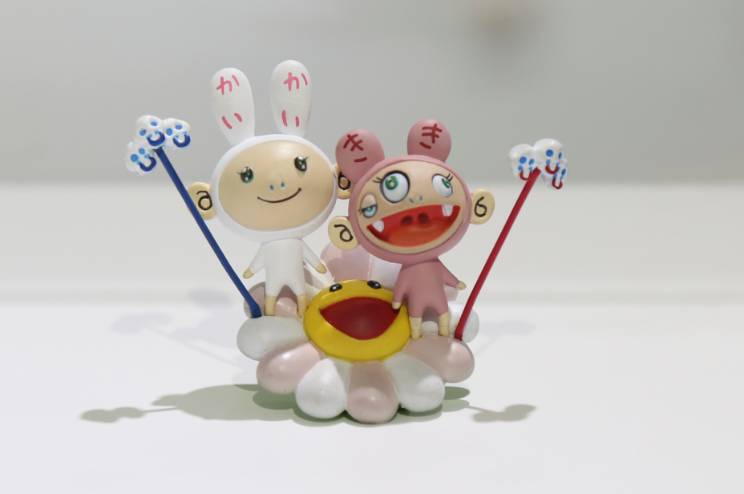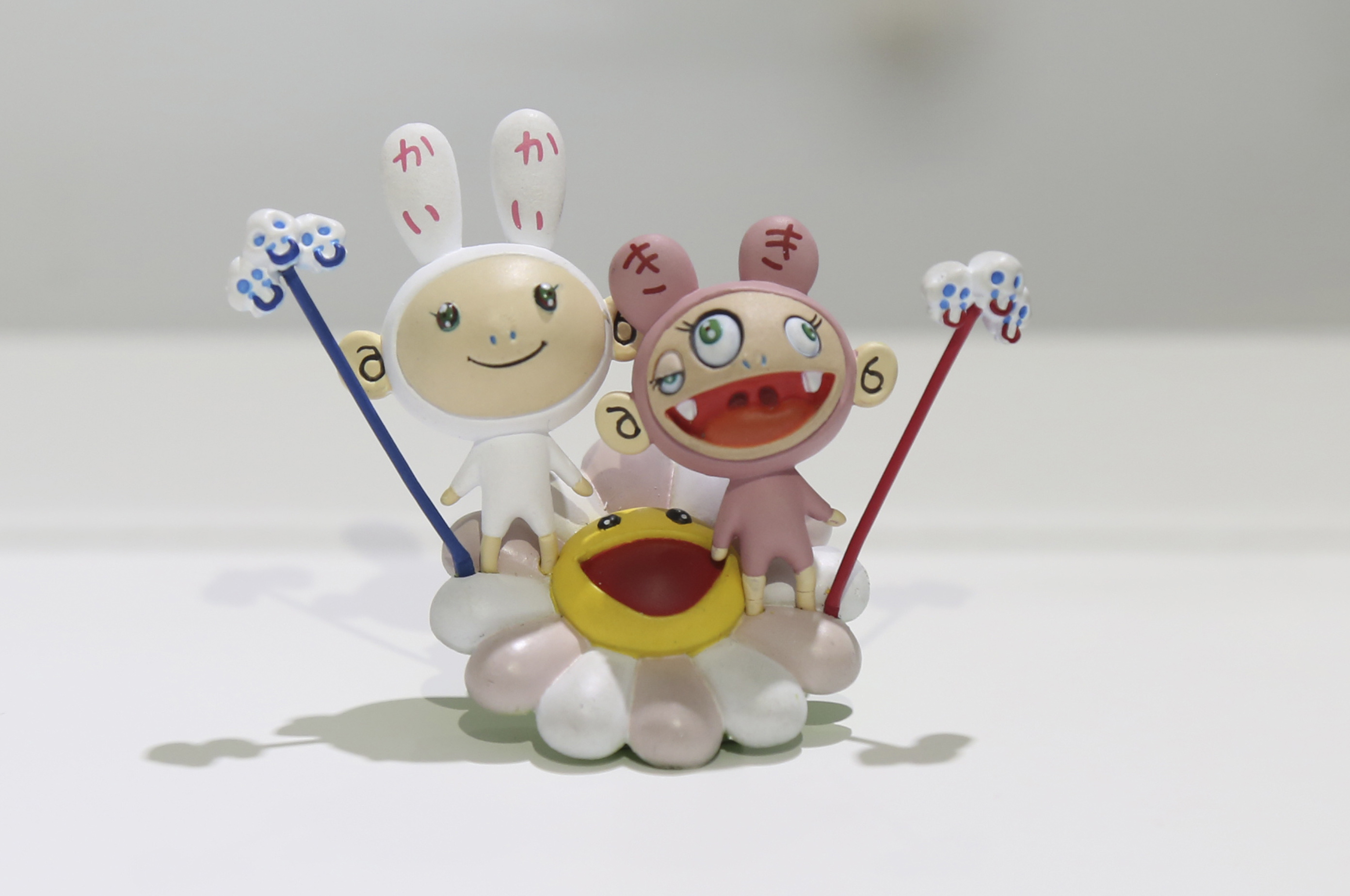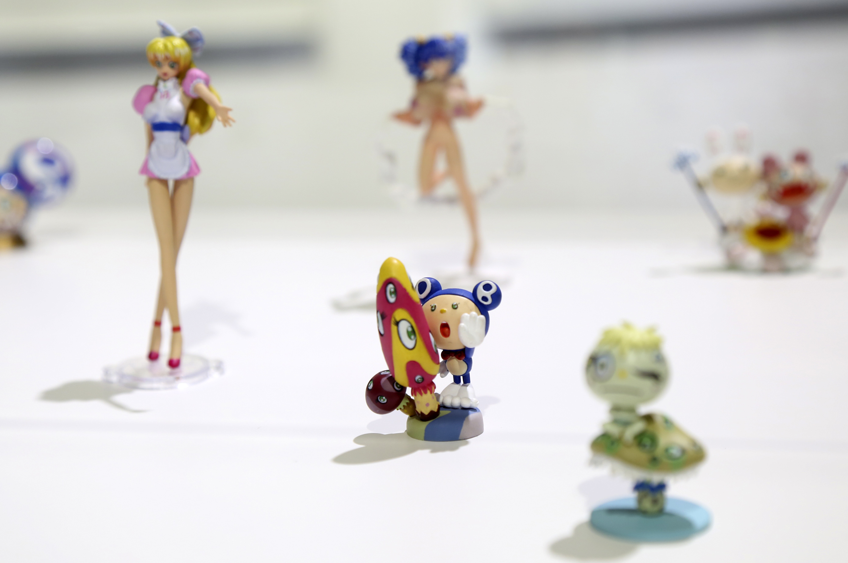 La obra de Murakami está poblada de personajes que van reapareciendo a lo largo de su trabajo en formas infinitamente ingeniosas. Entre ellos está Mr. DOB, un personaje similar a Mickey Mouse, que aparece en varias de las obras que se presentan en esta exposición; Hyakume, de forma oval, con reminiscencias de un personaje manga y similar a un Buda así como las flores sonrientes que se repiten en una paleta confusa de colores brillantes que forman complejos diseños y de gran riqueza en las formas.