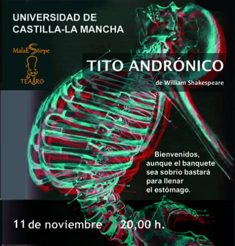 A cargo del ya legendario grupo de la Universidad de Castilla La Mancha Malaestirpe, el argumento de Tito Andrónico nos cuenta la historia del más valiente general romano que regresa coronado de laurel. No sabe que seguir sus estrictos valores éticos puede atraer una terrible cadena de calamidades y venganzas que recaerán sobre su familia. El teatro se convierte en una respetuosa ceremonia, el espacio escénico se sacraliza y los actores usan su vestuario más austero como seña de humildad y respeto hacia el gran bardo inglés.