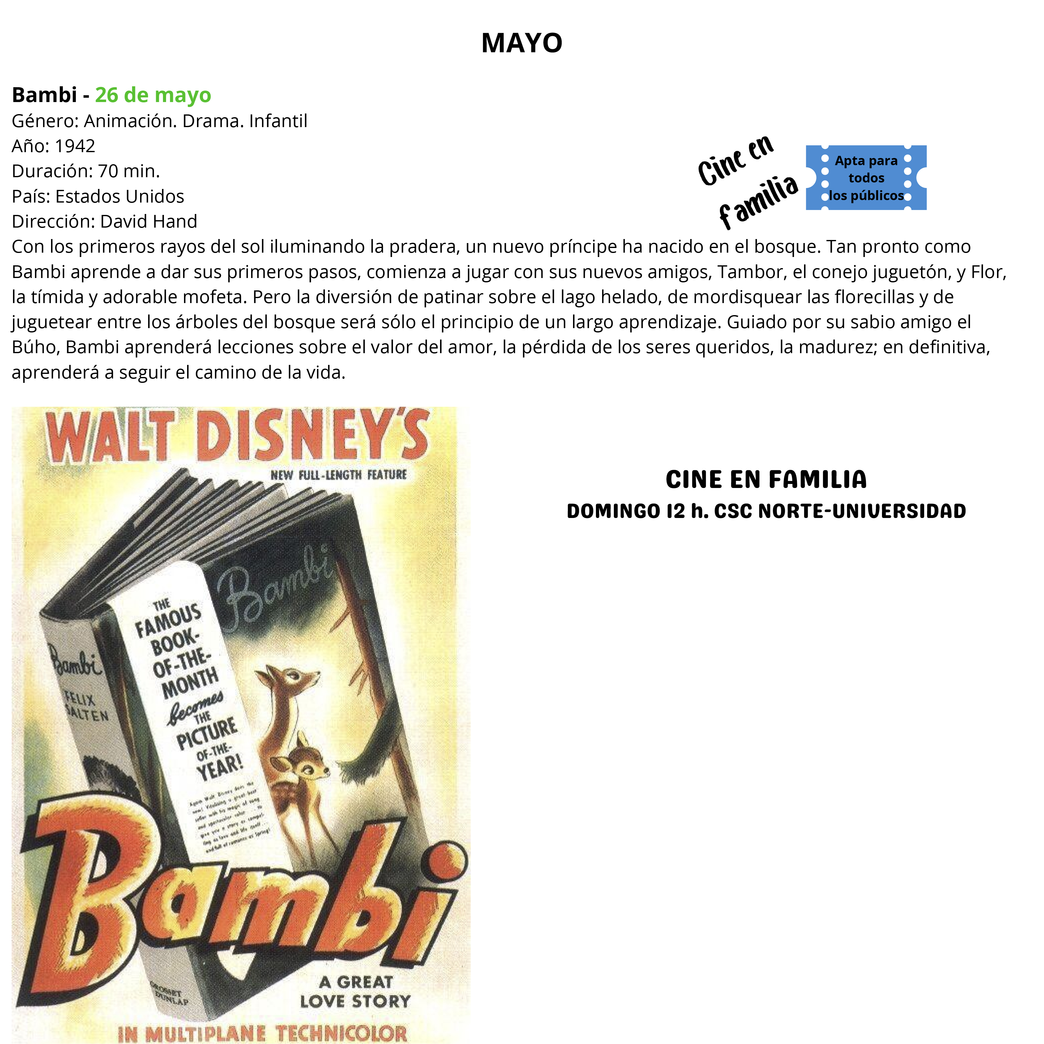 El Cine en Familia proyecta este fin de semana el clásico de animación "Bambi", el domingo 26 de mayo en el Centro Sociocultural Norte-Universidad, a las 12:00 h. La retirada de invitaciones podrá realizarse desde el lunes en el propio centro, de 10:00 h a 14:00 h y de 17:00 h a 20:00 h.