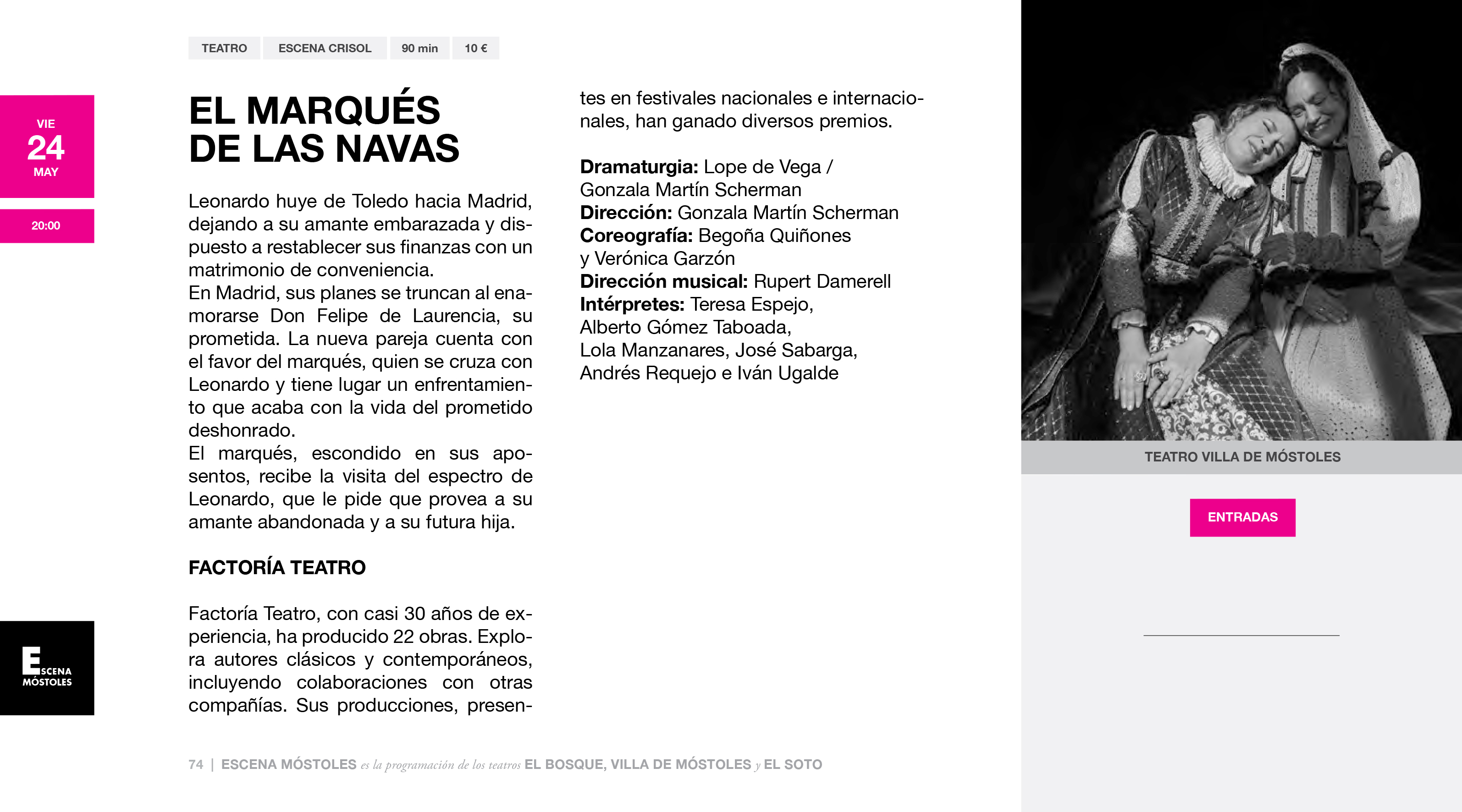 Y dentro de la programación Escena Móstoles, el viernes en el Teatro Villa de Móstoles, se llevará a cabo la representación "El marqués de las Navas", de Lope de Vega, a las 20:00 h. Leonardo huye de Toledo hacia Madrid, dejando a su amante embarazada y dispuesto a restablecer sus finanzas con un matrimonio de conveniencia. La compañía Factoría Teatro, con casi 30 años de experiencia, trae esta puesta en escena a Móstoles.