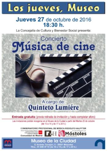 Imagen en alta resolución. Este enlace se abrirá mediante lightbox, puede haber un cambio de contextoLunes 24 de octubre de 2016.- La Concejalía de Cultura y Bienestar Social presenta el jueves 27 a las 18:30 horas en el Museo de la Ciudad el concierto "Música de Cine" interpretado por el Quinteto Lumiére.