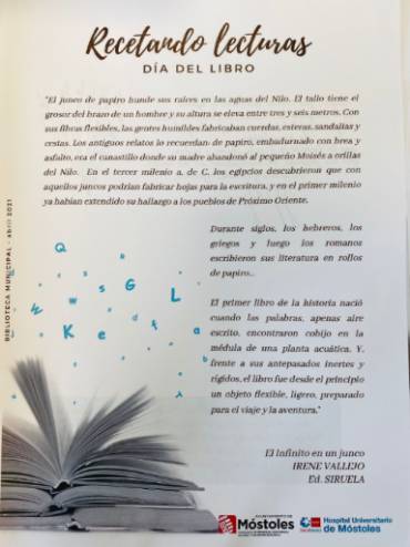 "Recetando Lecturas", es una iniciativa que surgió en 2017 como resultado de la colaboración del Ayuntamiento, a través de la Biblioteca Municipal de Móstoles, y el Hospital Universitario, para conmemorar el Día del Libro. La difícil situación provocada por la pandemia impidió que se pudiese celebrar en 2020.