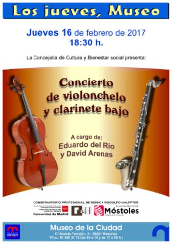 Imagen en alta resolución. Este enlace se abrirá mediante lightbox, puede haber un cambio de contextoLa Concejalía de Cultura y Bienestar Social presenta en el Museo de la Ciudad, el jueves 16 de febrero a las 18:30 horas un recital de violonchelo y clarinete bajo, a cargo de Eduardo del Río y David Arenas, ambos profesores del Conservatorio de Grado Profesional "Rodolfo Halffter". Se interpretarán obras de J.S. Bach, I. Boccherini y G. Rossini".