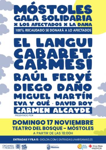 - El Teatro del Bosque va a acoger una gala solidaria, el próximo domingo 17 noviembre, a las 18:00 h, en apoyo a los afectados por la DANA, organizada por Unarisamas Producciones y Fun Fun Comedy, junto al Ayuntamiento de Móstoles.