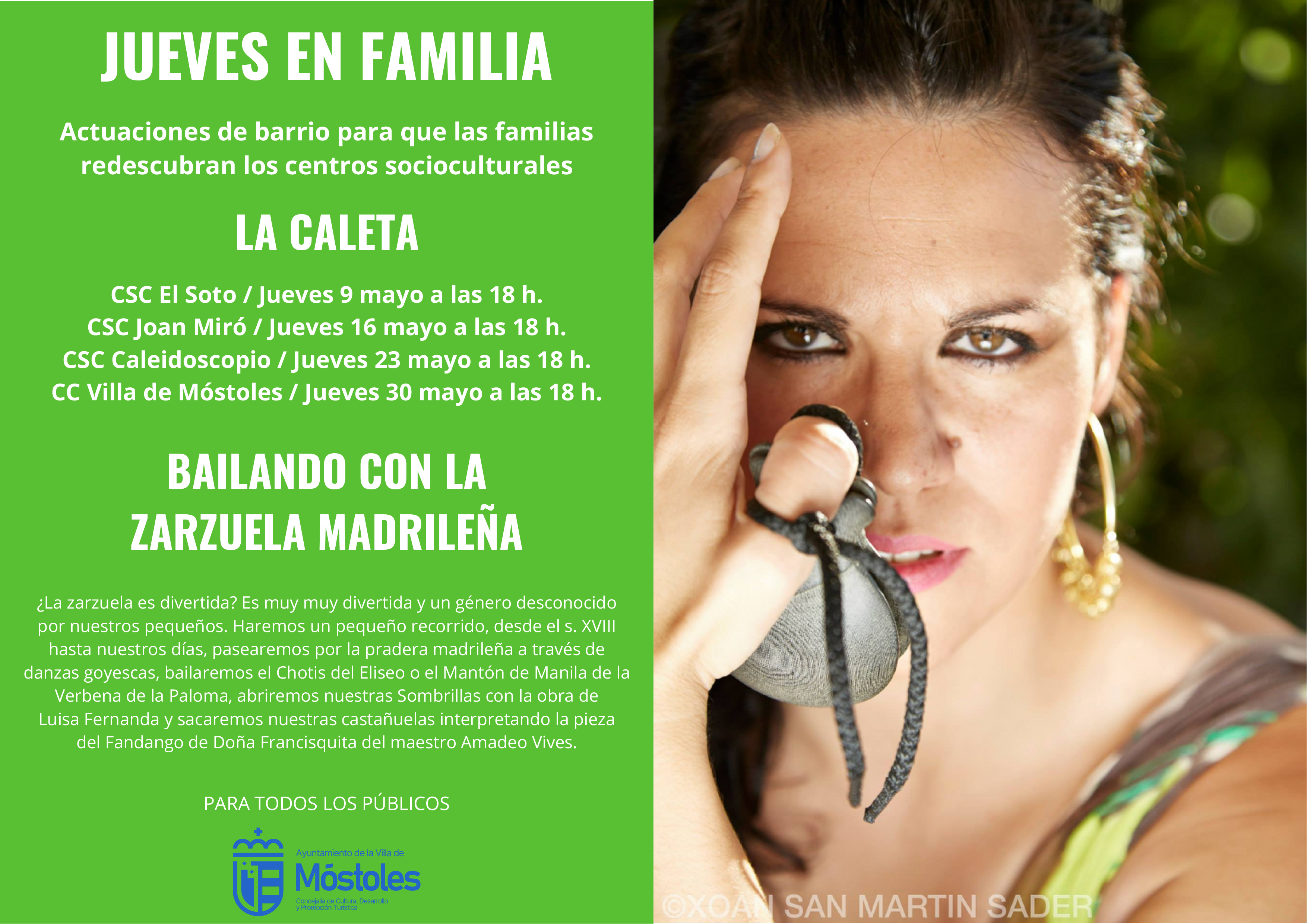 Del 9 al 30 de mayo, los centros socioculturales de la ciudad acogen el espectáculo "Bailando con la zarzuela madrileña", representado por La Caleta, compañía local que nos invitan a un espectáculo para público familiar y participativo, con un recorrido de la Zarzuela desde el siglo XVIII hasta nuestros días.