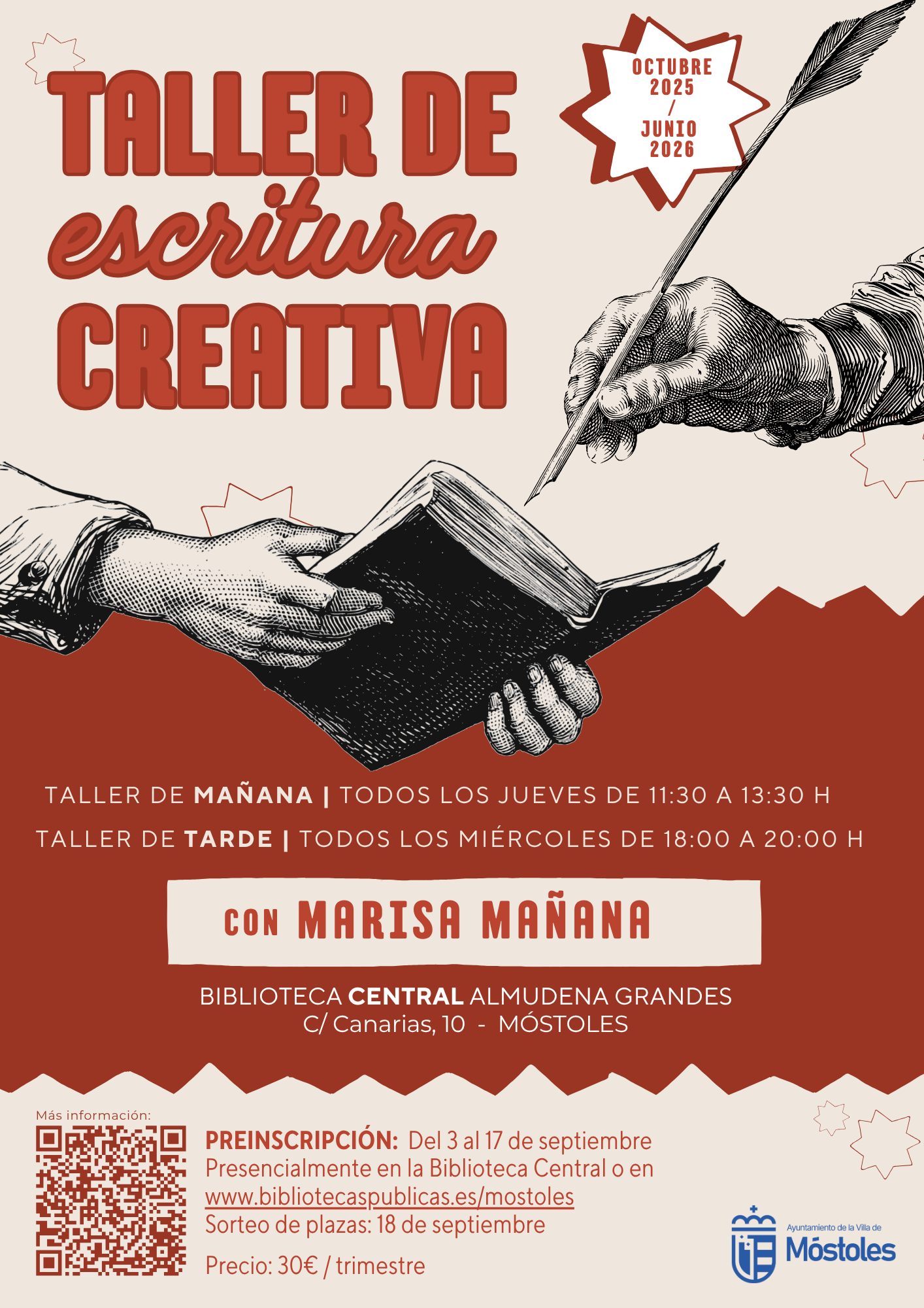 Comienza el plazo para la preinscripción de actividades de adultos de la Biblioteca Central, "Clubes de lectura", "Taller de escritura creativa" y "Madrid Literario: ciclo de charlas y visitas". Se puede apuntar de manera presencial o en la web de la Biblioteca https://bibliotecaspublicas.es/mostolesEste enlace se abrirá en una ventana nueva.