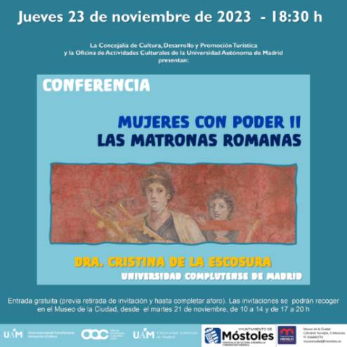 En el Museo de la Ciudad, conferencia "Mujeres con poder II, las matronas romanas". Impartida por la Dra. Cristina de la Escosura, de la Universidad Complutense de Madrid, a las 18.30 h.