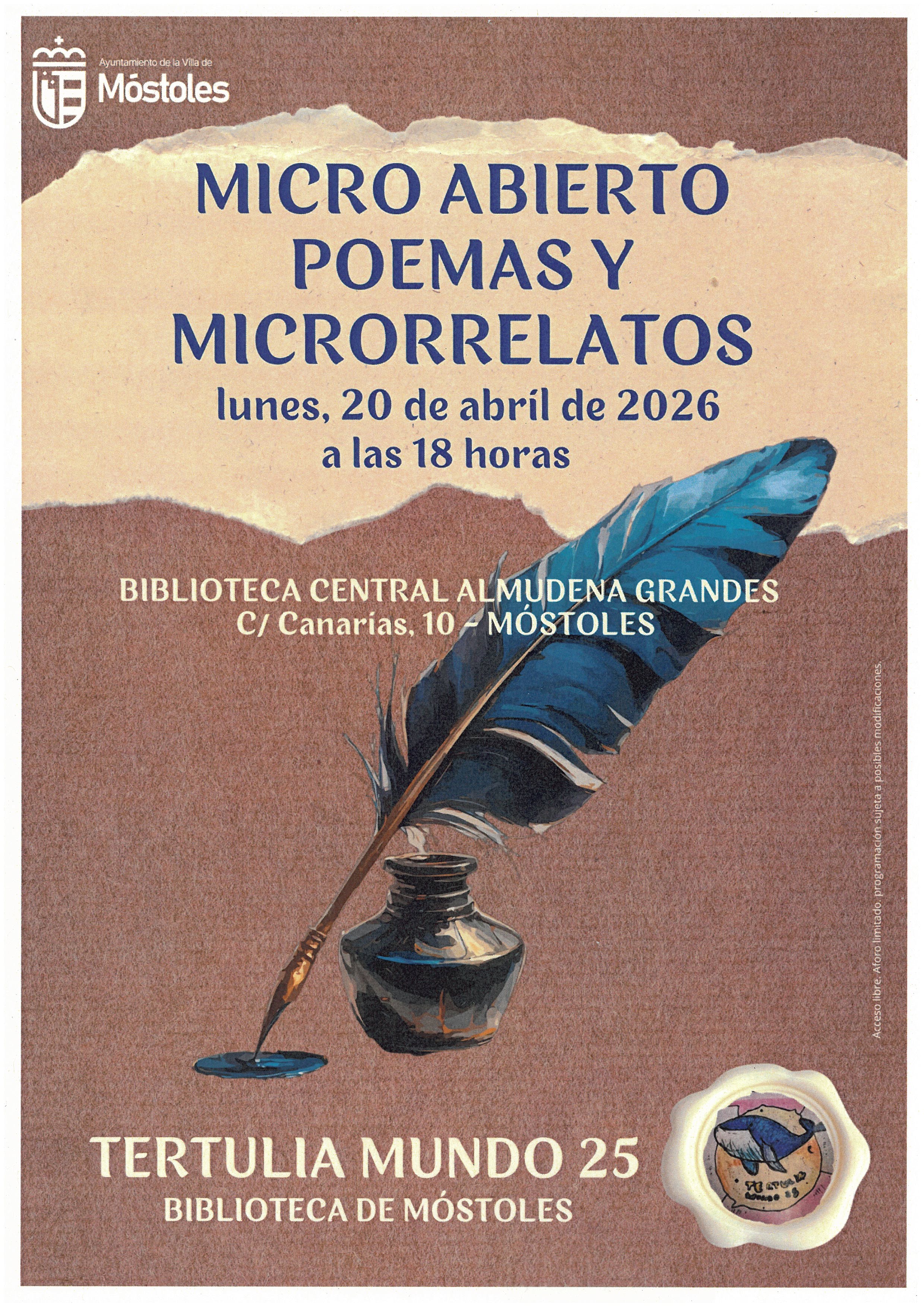 "Micro abierto, poemas y microrrelatos", a cargo de Tertulia Mundo 25, en la Biblioteca Central Almudena Grandes a las 18:00 horas. Entrada libre hasta completar aforo.