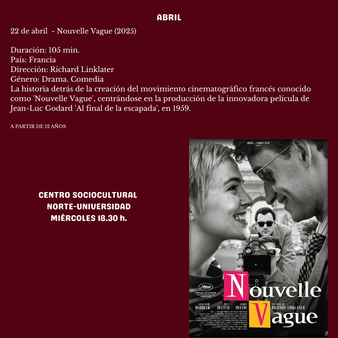 "Nouvelle Vague (2025)", proyección de la película dentro del ciclo Filmoteca de Móstoles, en el Centro Sociocultural Norte-Universidad a las 18:30 horas. Entrada gratuita previa retirada de invitaciones en el propio centro desde el lunes 20 de abril.