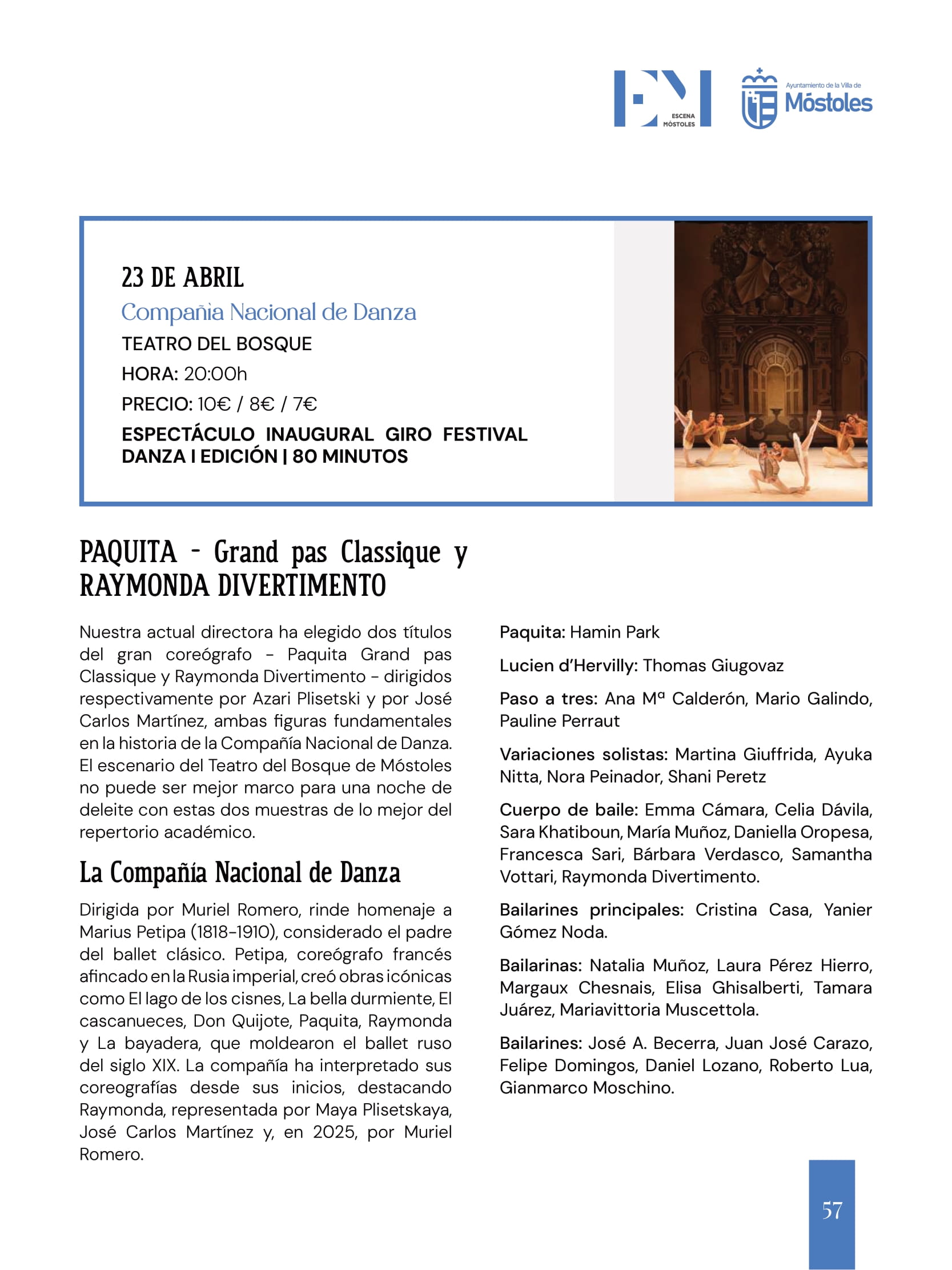 "Paquita Grand pas Classique" y "Raymonda Divertimento", dentro del Giro Danza Festival, dirigidos respectivamente por Azari Plisetski y por José Carlos Martínez, de la Compañía Nacional de Danza, en el Teatro del Bosque a las 20:00 horas. Precio: 10, 8 y 7 €. 80 minutos. Para todos los públicos. Venta de entradas online o en taquillas de los teatros municipales.