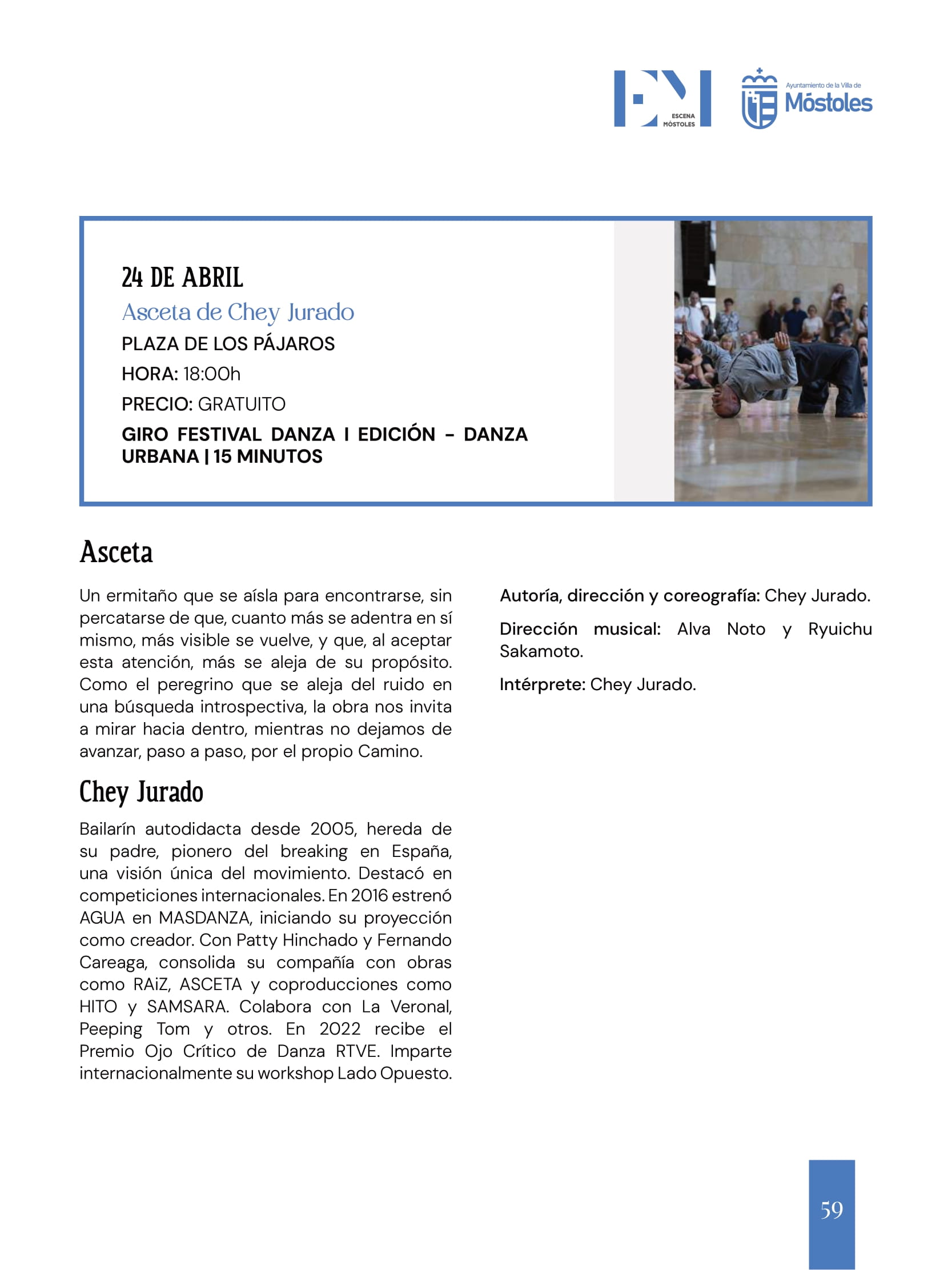 "Asceta", danza a cargo de Chey Jurado, dentro de Giro Danza Festival, en la Plaza de los Pájaros a las 18:00 horas. Entrada gratuita. 15 minutos. Para todos los públicos.