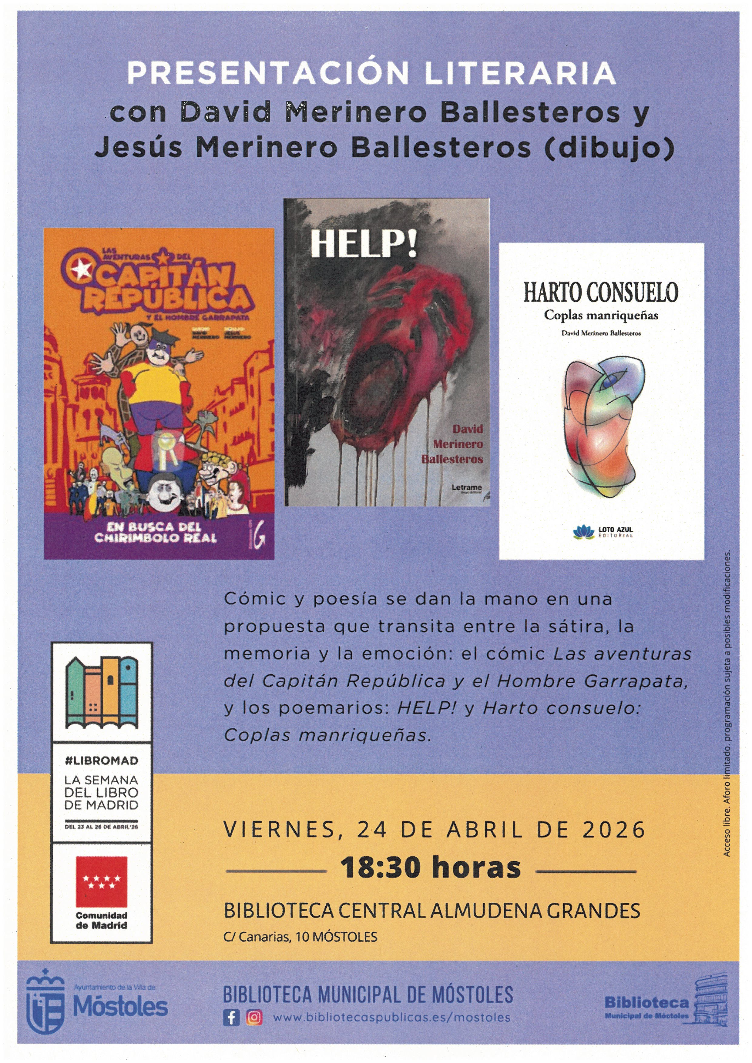 "Presentación literaria", a cargo de David Merinero Ballesteros y Jesús Merinero Ballesteros (dibujo), presentando los cómics Las aventuras del Capitán República y el Hombre Garrapata, y los poemarios HELP! y Harto consuelo: copias manriqueñas, en la Biblioteca Central Almudena Grandes a las 18:30 horas. Entrada libre hasta completar aforo.