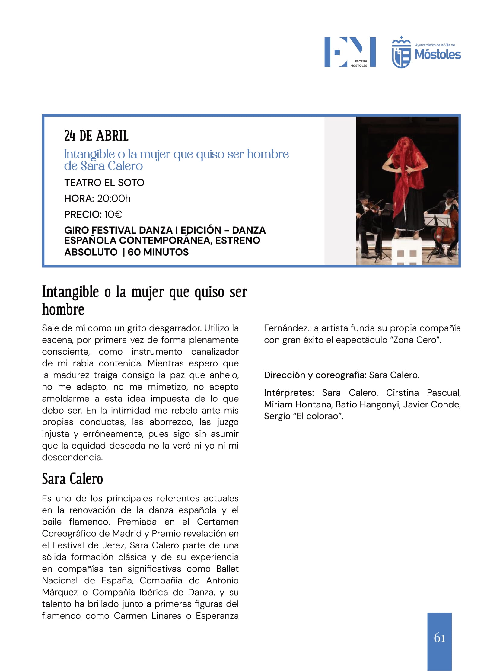 "Intangible o la mujer que quiso ser hombre", dentro de Giro Danza Festival, danza española y flamenco a cargo del Sara Calero, acompañado de la JORCAM, en el Teatro El Soto a las 20:00 horas. Precio: 10 €. 60 minutos. Para todos los públicos. Venta de entradas online o en taquillas de los teatros municipales.
