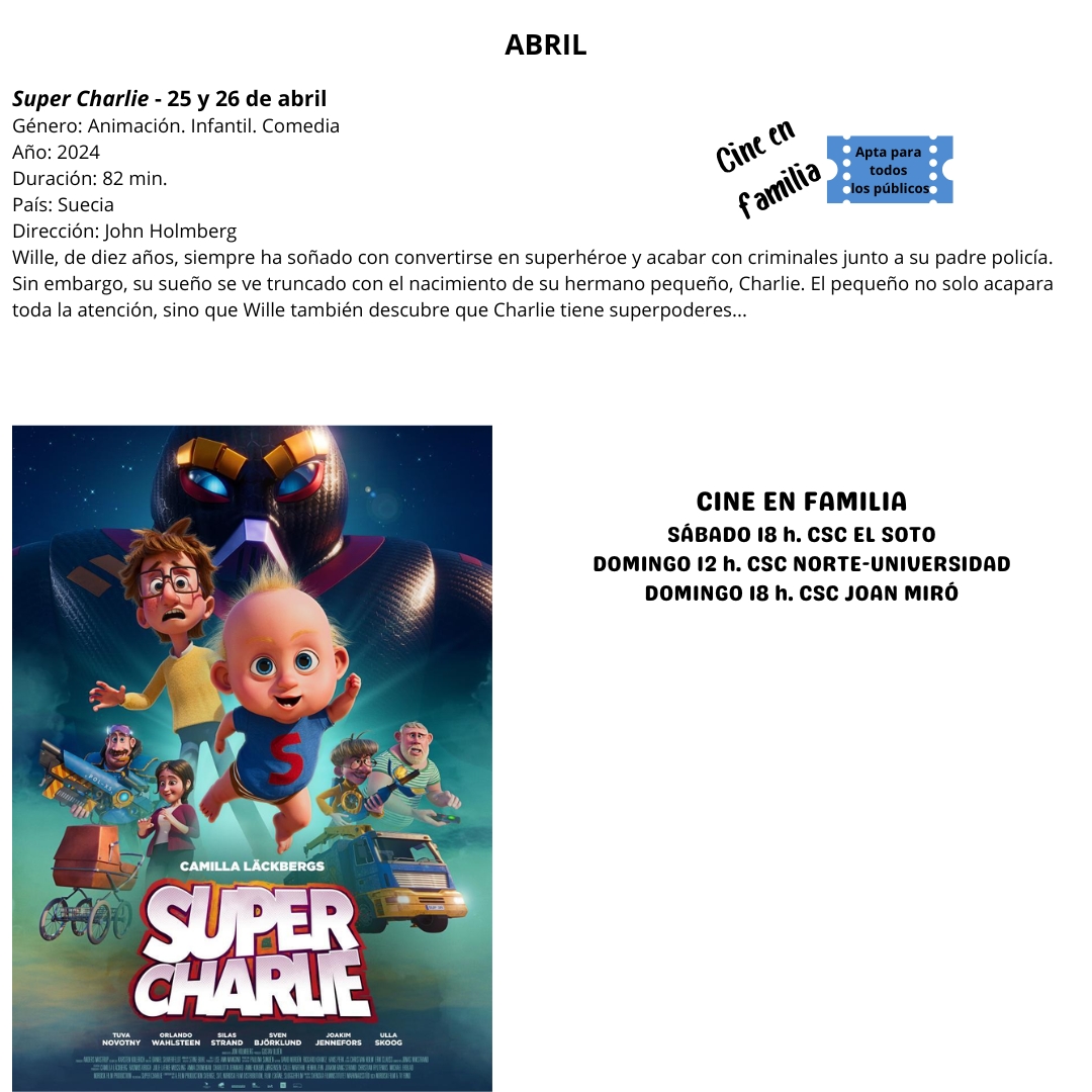 "Super Charlie", proyección gratuita dentro de Cine en familia, en el Centro Sociocultural Norte-Universidad a las 12:00 horas, y en el Centro Sociocultural Joan Miró a las 18:00 horas. Para todos los públicos. Retirada de invitaciones desde el lunes en el propio centro, de 10 a 14 y de 17 a 20 horas.