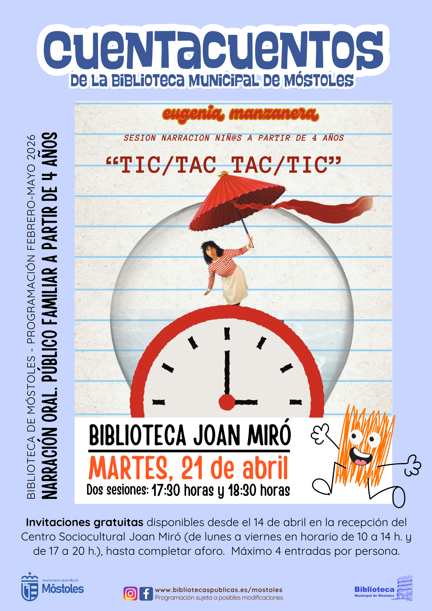 "Tic/Tac Tac/Tic", cuentacuentos a cargo de Eugenia Manzanera, en la Biblioteca del CSC Joan Miró a las 17:30 y 18:30 horas (2 sesiones de 30 minutos). A partir de cuatro años. Entrada gratuita previa retirada de invitaciones en la recepción del propio centro desde el 14 de abril de 10:00 a 14:00 y de 17:00 a 20:00 horas.