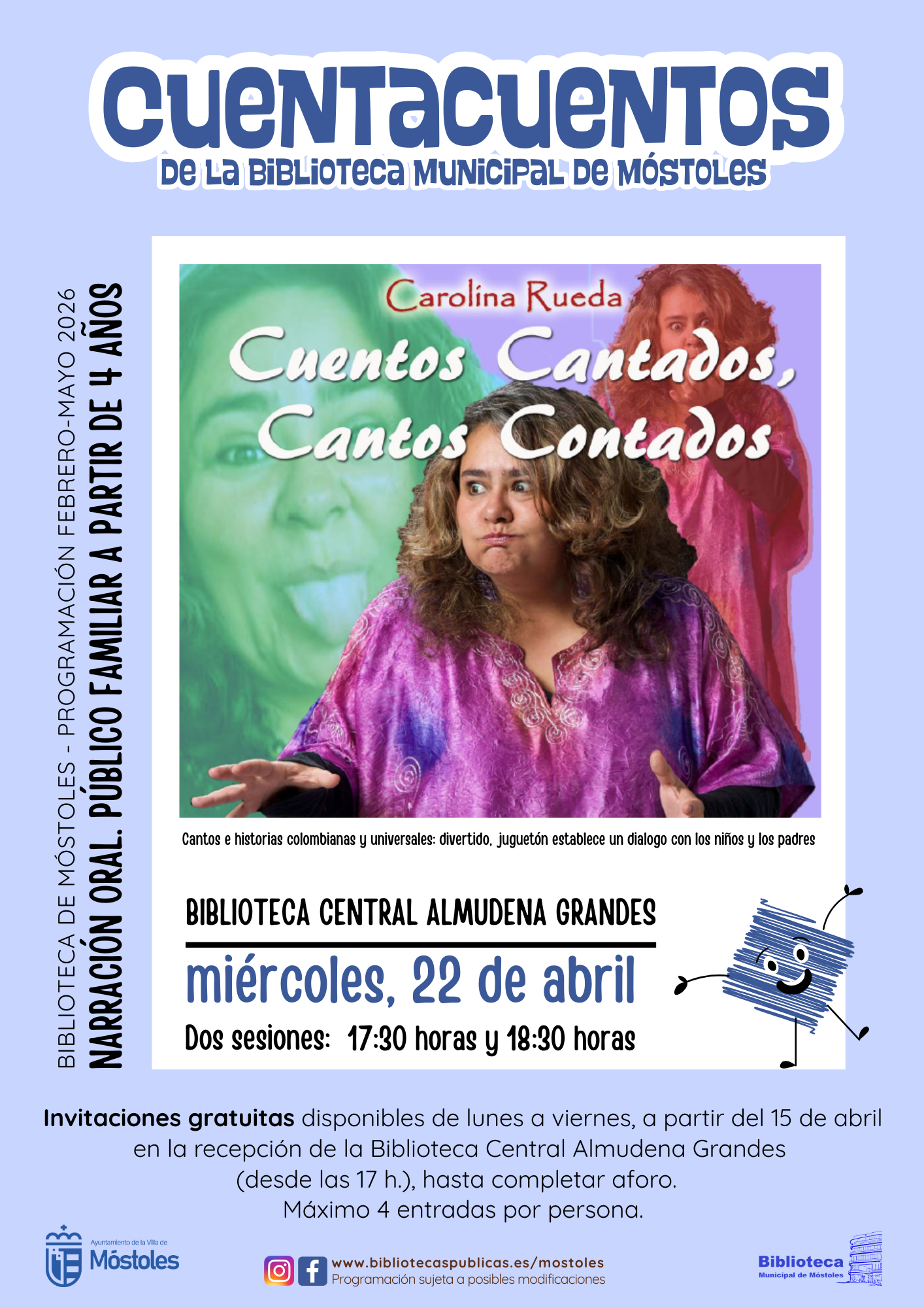 "Cuentos cantados, cantos contados", cuentacuentos a cargo de Carolina Rueda, en la Biblioteca Central Almudena Grandes a las 17:30 y 18:30 horas (2 sesiones de 30 minutos). A partir de cuatro años. Entrada gratuita previa retirada de invitaciones en la recepción del propio centro desde el 15 de abril (desde las 17 h.), hasta completar aforo. Máximo 4 entradas por persona.