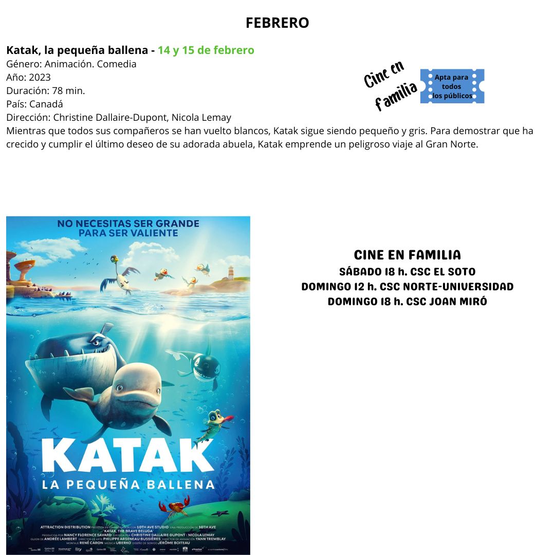 "Katak, la pequeña ballena", proyección gratuita dentro de Cine en familia, en el Centro Sociocultural Norte-Universidad a las 12:00 horas, y en el Centro Sociocultural Joan Miró a las 18:00 horas. Para todos los públicos. Retirada de invitaciones desde el lunes en el propio centro, de 10 a 14 y de 17 a 20 horas.