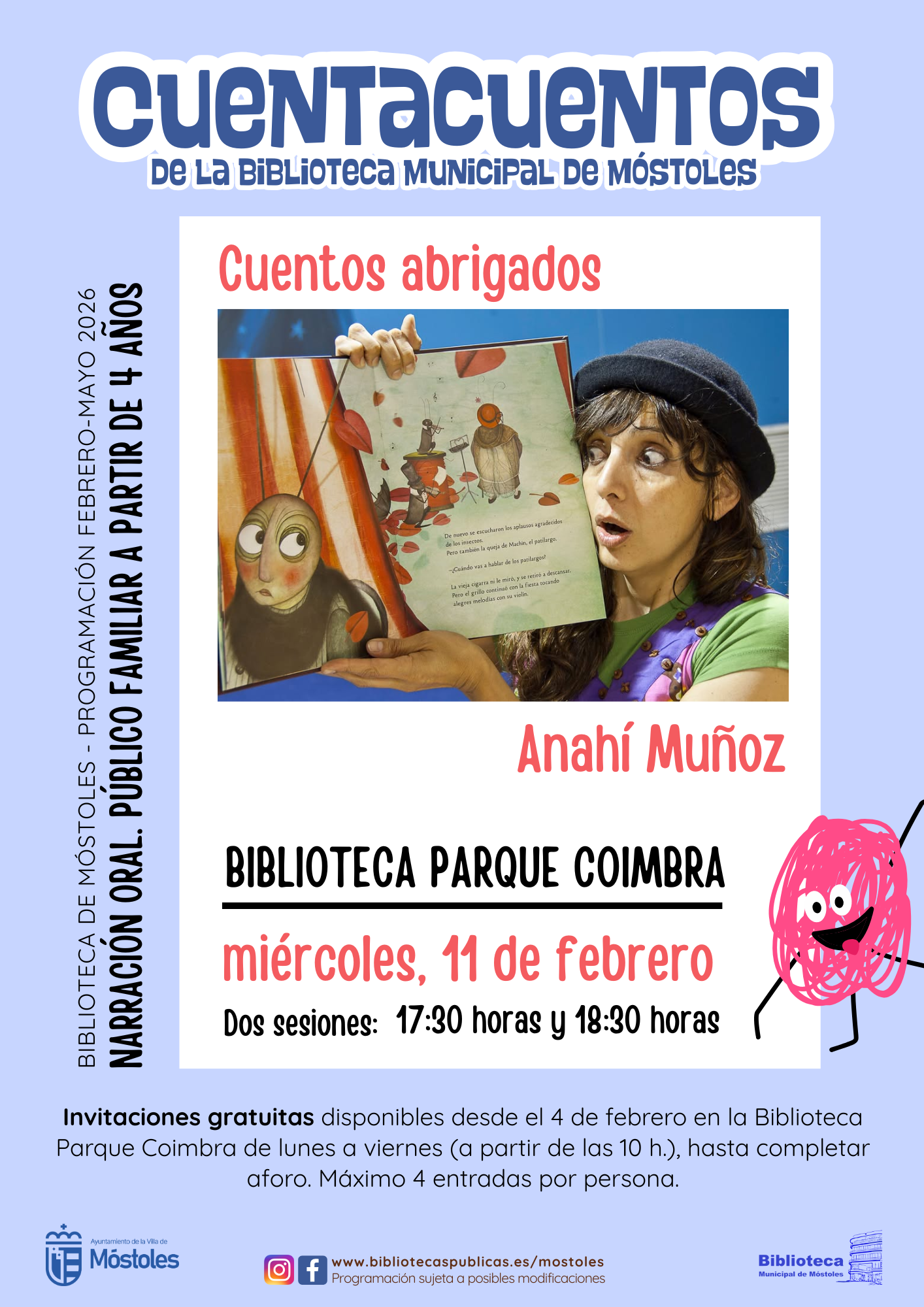 "Cuentos abrigados", cuentacuentos a cargo de Anahí Muñoz, en la Biblioteca Parque Coimbra a las 17:30 y 18:30 horas (2 sesiones de 30 minutos). A partir de cuatro años. Entrada gratuita previa retirada de invitaciones en la recepción del propio centro desde el 4 de febrero de 10:00 a 14:00 y de 17:00 a 20:00 horas.