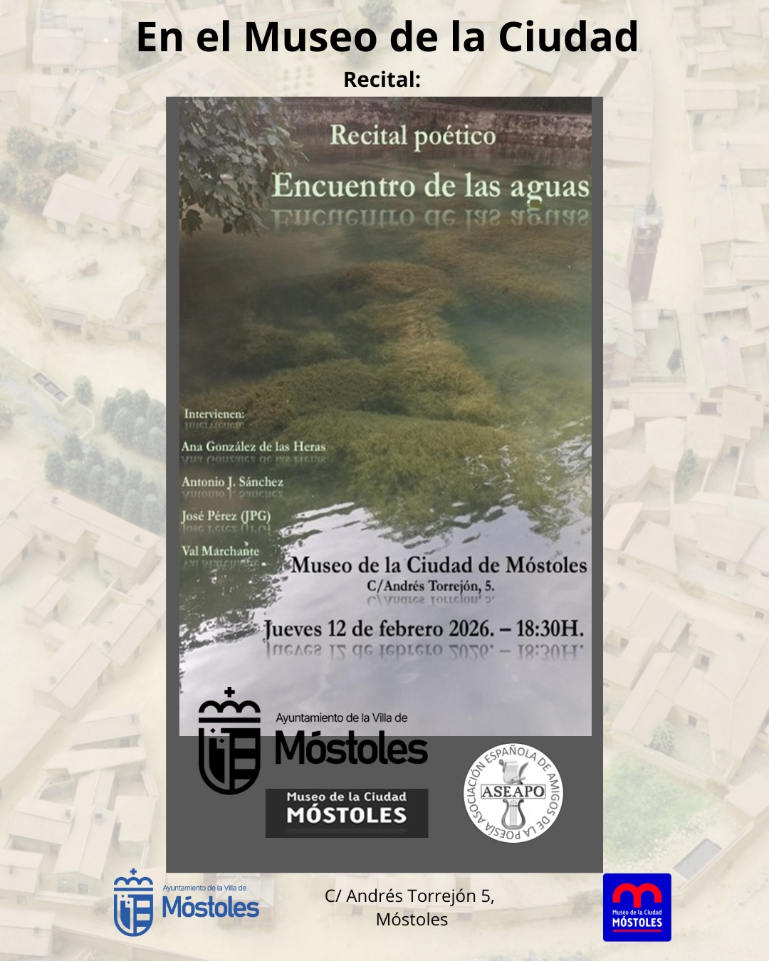 "Encuentro de las aguas", recital poético a cargo de ASEAPO, en el Museo de la Ciudad a las 18:30 horas. Intervienen: Ana González de las Heras, Antonio J. Sánchez, José Pérez (JPG) y Val Marchante. Entrada gratuita previa retirada de invitaciones en el propio centro a partir del martes 10 de febrero.