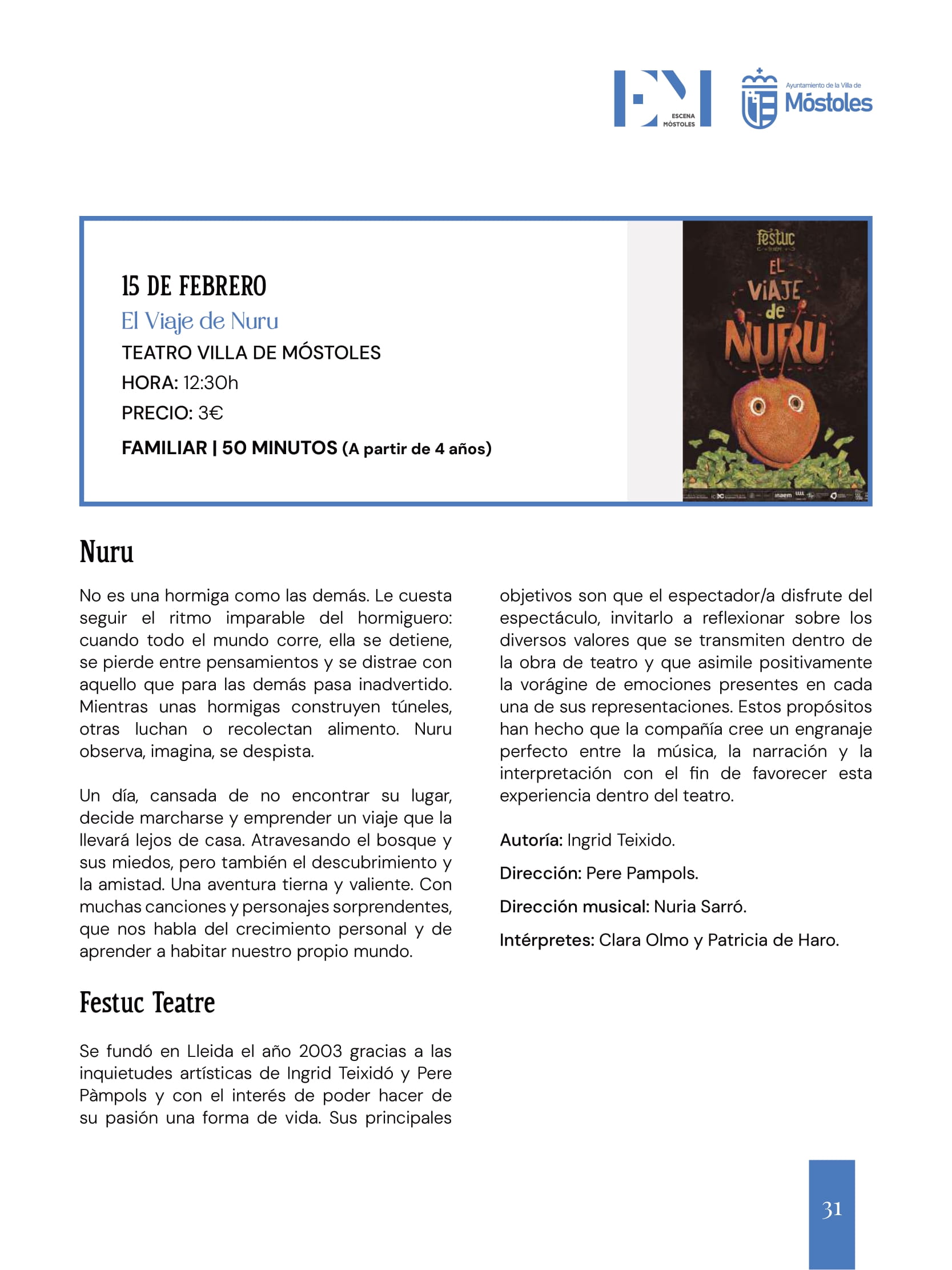 "El viaje de Nuru", títeres a cargo de la compañía Festuc Teatre, en el Teatro Villa de Móstoles a las 12:30 horas. Precio: 3 €. 50 minutos. Para todos los públicos. Venta de entradas online o en taquillas de los teatros municipales.