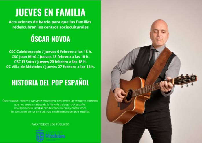 En esta ocasión, se trata del artista mostoleño, cantante, músico e intérprete, Óscar Novoa, que con su guitarra y su talento va a ofrecer "Historias del pop español", dentro de la programación Jueves en Familia, organizada por el Ayuntamiento de Móstoles, a través de la Concejalía de Cultura, Desarrollo y Promoción Turística.