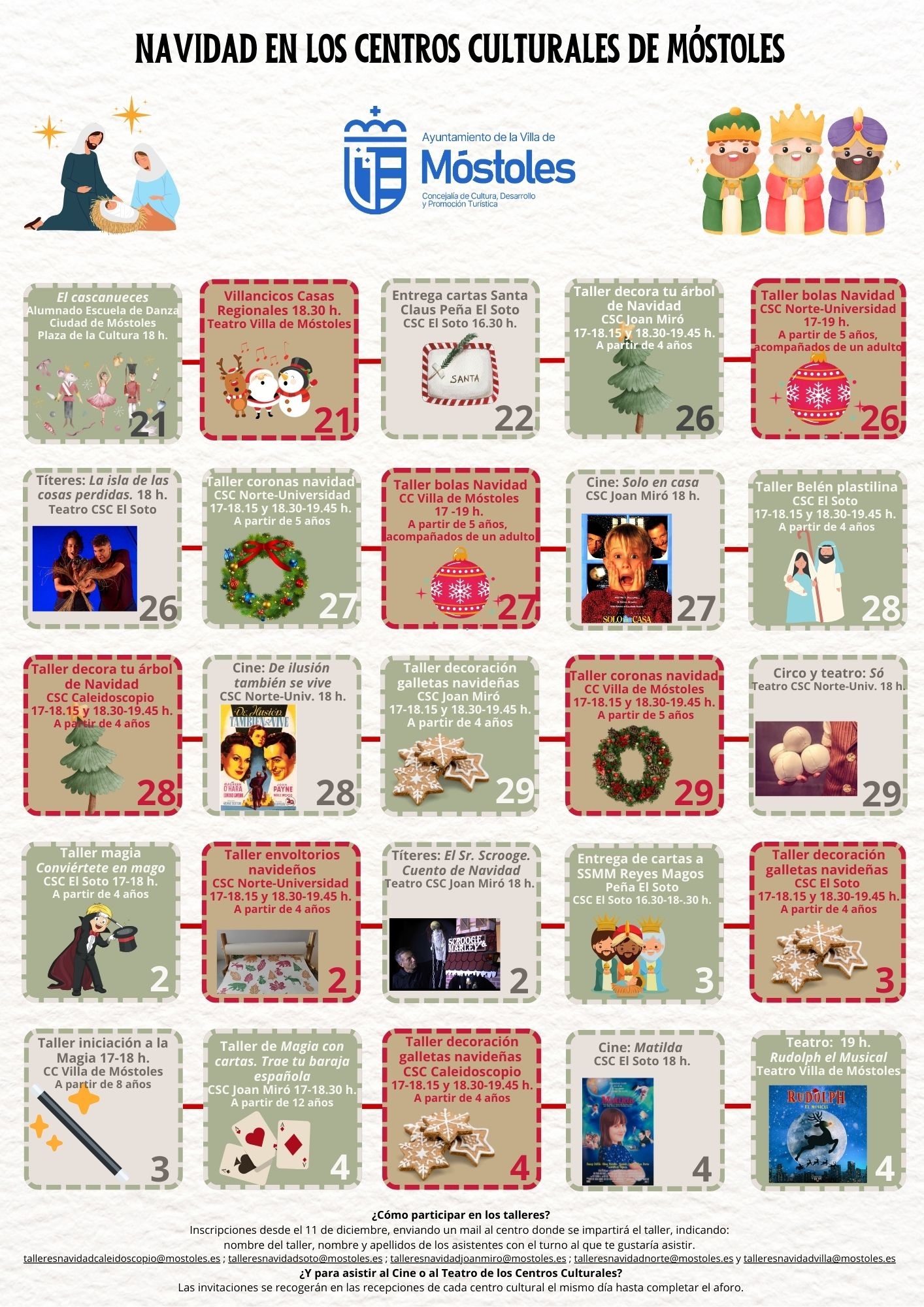 Los centros culturales de Móstoles se llenarán de actividades gratuitas para público familiar en Navidad. Del 21 de diciembre al 4 enero, habrá talleres de adornos navideños y de magia, espectáculos infantiles, villancicos y hasta una interpretación de un fragmento del Cascanueces, a cargo de la Escuela de Danza Ciudad de Móstoles. Comienzan las inscripciones a todos los talleres hasta completar el aforo.