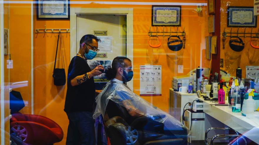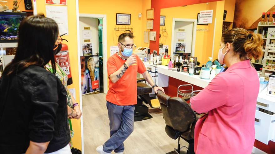 Imagen en alta resolución. Este enlace se abrirá mediante lightbox, puede haber un cambio de contextoLa Alcaldesa de Móstoles, Noelia Posse, acompañada por la Concejala de Presidencia, Rebeca Prieto, la Concejala Presidenta de la Junta de Distrito 4, Marisa Ruiz y la Portavoz de Podemos y Presidenta de la Comisión Especial de Estudio y Dirección de la Estrategia de Salida de la crisis provocada por el coronavirus, Mónica Monterreal, ha visitado el establecimiento JL Peluqueros.