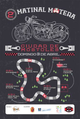Cartel 2 Matinal moteraImagen en alta resolución. Este enlace se abrirá mediante lightbox, puede haber un cambio de contextoCartel 2 Matinal moteraEl Ayuntamiento de Móstoles, la Empresa Municipal de Promoción Económica, EMPESA, la Federación de Comerciantes de Móstoles, el Club Deportivo Motor Móstoles y la Escuela de Pilotos KSB Sport Madrid organiza el domingo 3 de abril de 2016, en el Parque Liana, la `II Matinal Motera ciudad de Móstoles´.