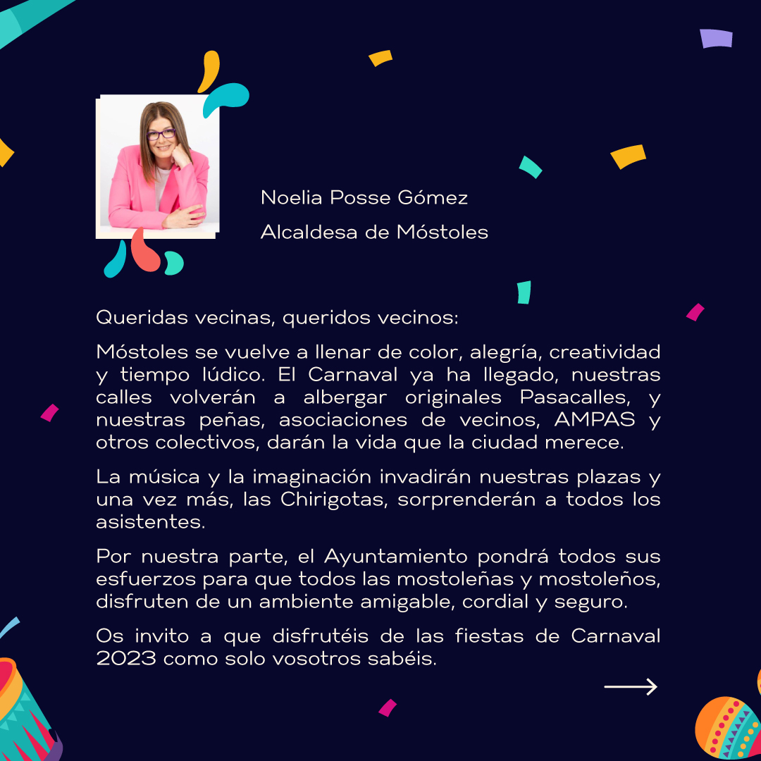 Móstoles Cartel Carnaval 2023Móstoles Cartel Carnaval 2023Más de 50 colectivos entre peñas y asociaciones de Móstoles participarán en el desfile de comparsas de carnaval que el próximo 18 de febrero volverá a llenar de disfraces y fantasía las calles de la ciudad.