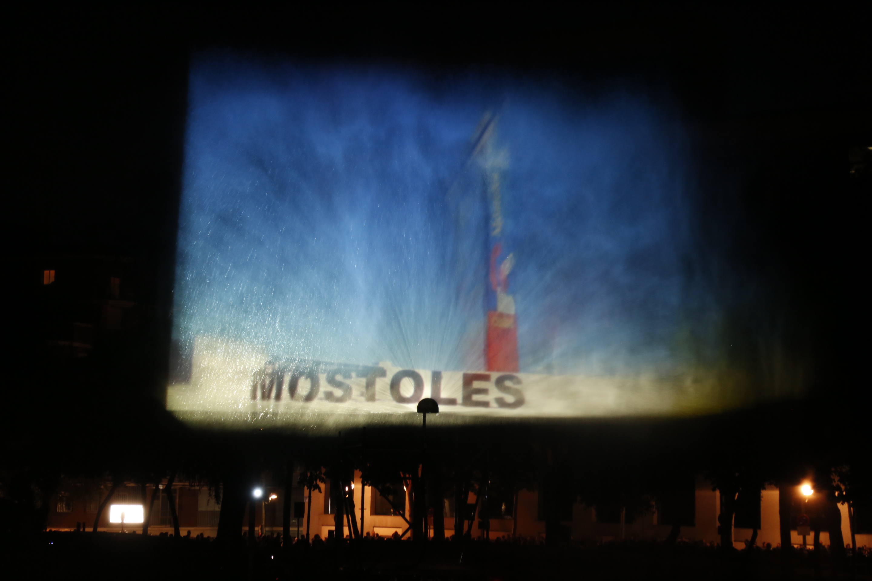 El juego de luces y colores estuvo acompañado de la voz en off del emotivo manifiesto `Yo en ti Móstoles´, así como el empleo, por primera vez, de una cortina de agua de 16 metros de altura en el que se han proyectado imágenes relacionadas con los acontecimientos del 2 de Mayo.