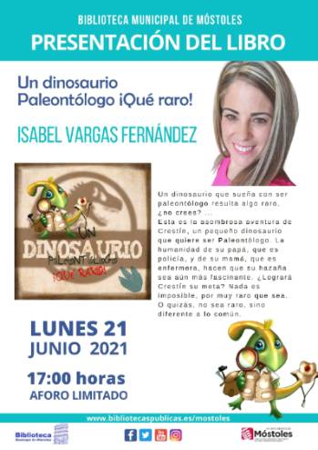 Imagen en alta resolución. Este enlace se abrirá mediante lightbox, puede haber un cambio de contextoHoy lunes 21, en la Biblioteca Central a las 17:00 h se presentará el libro infantil "Un dinosaurio paleontólogo ¡Qué raro!", escrito por la mostoleña Isabel Vargas Fernández. La presentación será pública, aunque se limitará el aforo para cumplir con las medidas de prevención de la COVID-19.