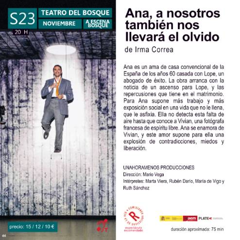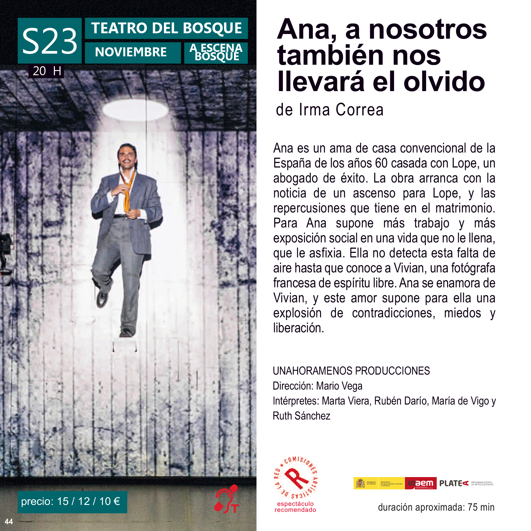 A Escena Bosque. "Ana, a nosotros también nos llevará el olvido", de Irma Correa. A las 20 horas, en el Teatro del Bosque.